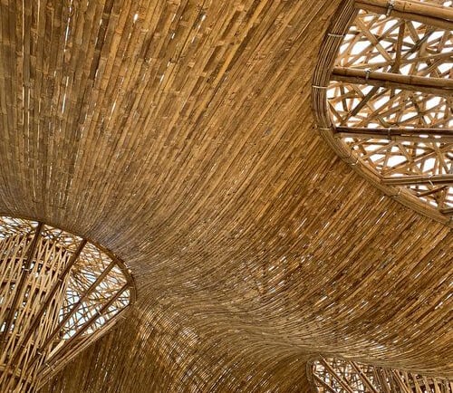 No necesita pesticidas, fertilizantes ni grandes cantidades de agua. Su cultivo absorbe grandes cantidades de CO₂ y libera hasta un 35% más de oxígeno que un bosque de árboles equivalentes. Construir con bambú es como plantar un árbol… pero en forma de casa.